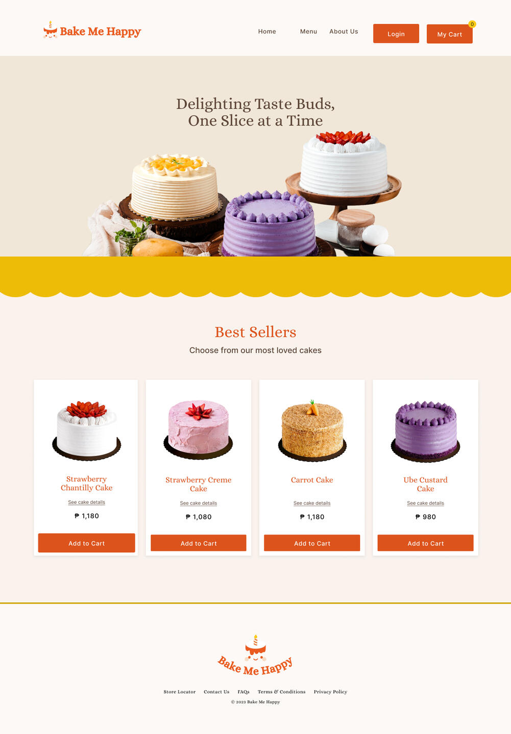 Brand design, web design, and front-end development for Bake Me Happy, a vibrant cake shop website. This project leverages PHP for backend development, alongside Bootstrap and JavaScript for the front end.