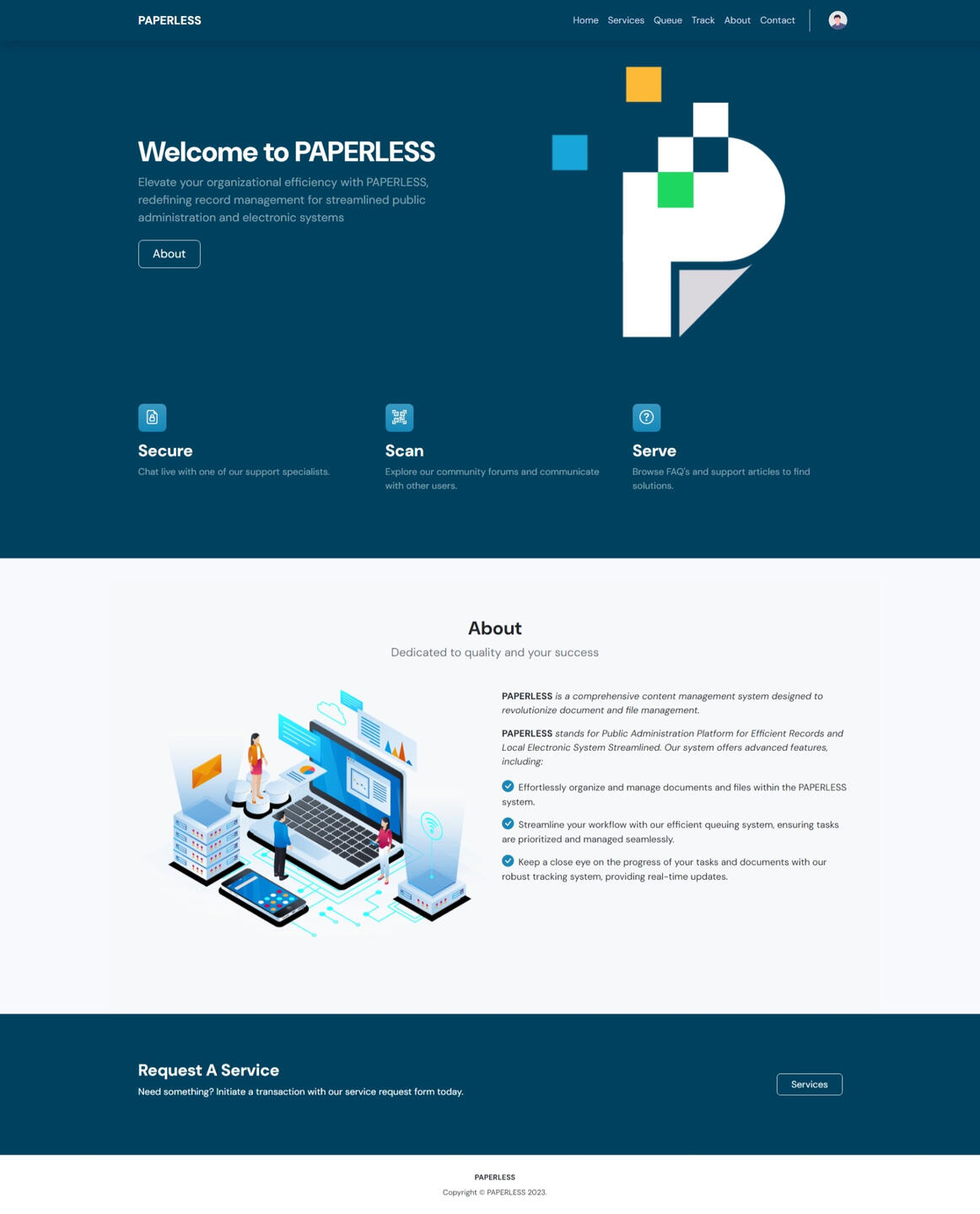 Logo design, web design, and front-end development for PAPERLESS, a Content Management System aimed at streamlining file release and request processes in city government. This project was completed as part of the IPT10 course requirement at Angeles University Foundation.